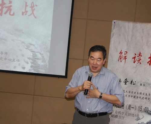 楊奎松教授長期從事中共黨史、中國現當代對外關系史、中國當代史及中國社會主義思想史研究,取得了豐碩成果。他結合自身的研究分析,用歷史的唯物主義和辯證的觀點剖析了毛澤東提出的持久戰等抗戰方針,講述了抗日民族統一戰線發展過程,通過例舉平型關大戰、百團大戰等,楊奎松教授比較了國共兩黨在正面戰場和敵后抗日中發揮的各自作用,深入解析了抗日戰爭時期國內外政治局勢以及兩黨關系演變。楊奎松強調,歷史研究要從第一手材料出發,全面解析歷史、社會和政治環境以及當事人的經歷、思維方式,努力還原歷史、認識歷史、以史為鑒。