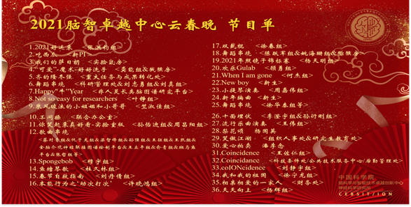 張燈結(jié)彩精神爽,辭舊迎新樂開懷。為讓廣大職工、博士后和學(xué)生們擁有一個快樂健康而有紀(jì)念意義的春節(jié),腦智卓越中心工會、團委、研究生會于2月9日下午舉辦了“云·迎新聯(lián)歡會”活動,本次活動首次采用線上直播和線下分會場相結(jié)合的方式,為海內(nèi)外的職工和師生送上新春美好的祝福。