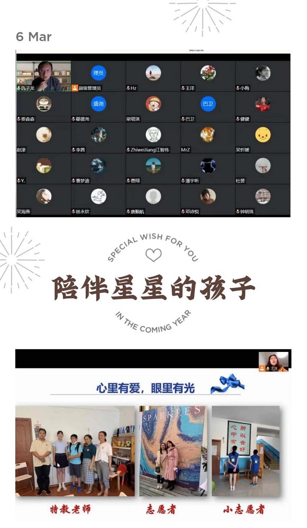 自2015年起,中心志愿者們充分發揮專業優勢,堅持開展自閉癥兒童陪護活動。為進一步擴充陪護隊伍,3月6日,中心開展了陪伴“星星的孩子”分享會,仇子龍研究員、王洋老師以及王梅、婁森森、鄢盛堯同學為大家分享了各自陪護“星星的孩子”的經歷,特教老師尤琦介紹了自閉癥兒童陪護的專業知識?;顒幼尭嗟娜苏J識到“星娃們”的純真、“星娃”家長們的心酸以及志愿陪護的意義。正如王洋老師的分享,我們每個人都是浩瀚宇宙的微小星光,但是微光會照亮微光,微光吸引微光,我們相互奔赴,微光匯聚終成璀璨星海,一起把整片天空照亮。