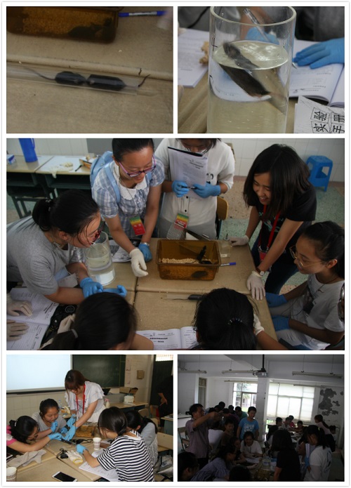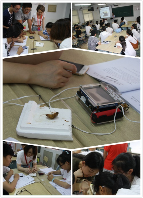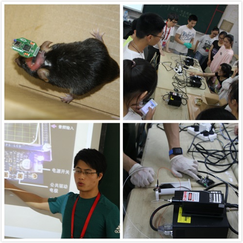 電生理組王佐仁、張翼鳳、杜久林為學(xué)生普及了神經(jīng)細(xì)胞電活動(dòng)的產(chǎn)生與傳播的科學(xué)知識(shí),以及可視化觀察和研究大腦、記錄神經(jīng)活動(dòng)的不同方法,讓學(xué)生明白了“腦機(jī)接口”和“腦機(jī)融合”等前沿概念,通過腦電波訓(xùn)練飛行員的案例激發(fā)大家的科學(xué)想象力。科普志愿者在出發(fā)前精心設(shè)計(jì),日夜趕工,為實(shí)驗(yàn)量身定制了輕巧便捷的生物電測(cè)量儀,通過光遺傳學(xué)控制小鼠行為、測(cè)試人體生物電、腦電對(duì)抗游戲、蟑螂腿跳舞、蟑螂間諜、熱激活果蠅、監(jiān)視斑馬魚運(yùn)動(dòng)等實(shí)驗(yàn),來加深中學(xué)生對(duì)腦電圖、肌電圖、動(dòng)作電位、反應(yīng)時(shí)長等基本概念的理解。