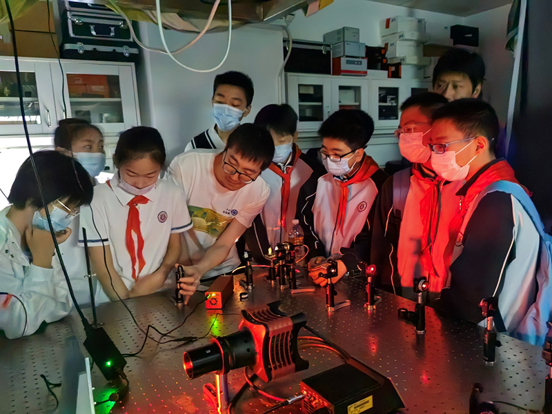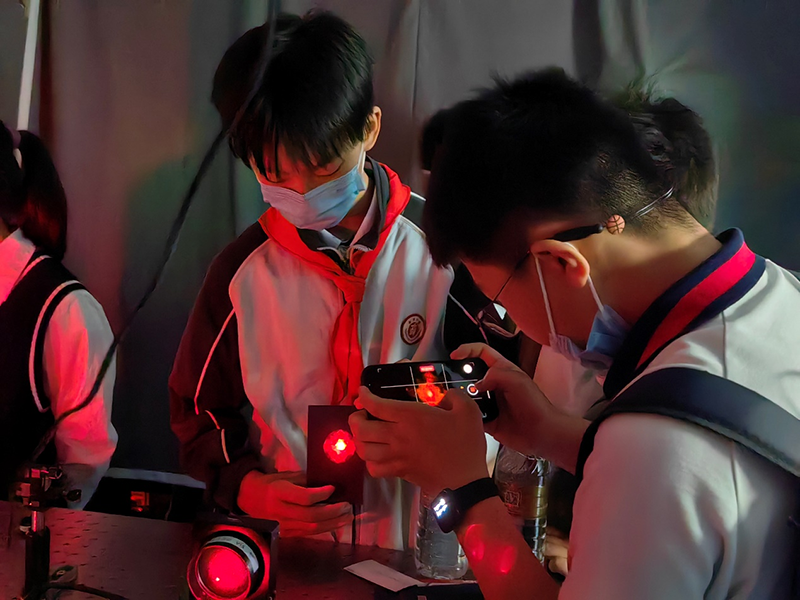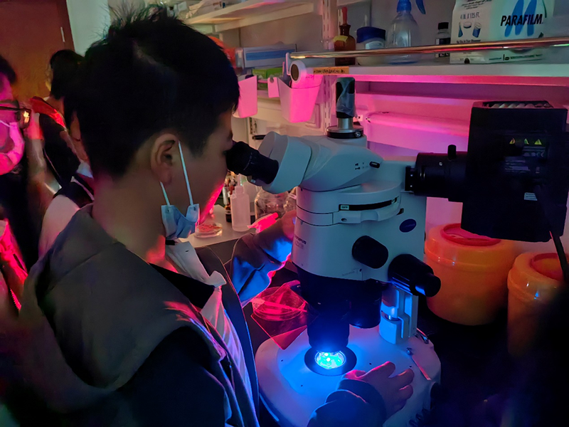 在強(qiáng)調(diào)了實驗室安全規(guī)范后,科普志愿者將參觀者分為多個小組,帶領(lǐng)他們比較了不同年齡階段線蟲的運(yùn)動狀態(tài)、年輕小鼠與年老小鼠的差異,講解了全息光學(xué)成像等多種儀器設(shè)備的用途,解讀了利用空間光調(diào)制器實現(xiàn)全息三維成像的原理,展示了通過光遺傳方法控制小鼠癢覺的過程,并讓他們近距離地觀察了胚胎的顯微注射。同學(xué)們對熒光蛋白在生物學(xué)領(lǐng)域的應(yīng)用有了一個初步的了解,在看到標(biāo)記有熒光信號的五顏六色的神經(jīng)組織時,他們表現(xiàn)出對從事科研的向往之情。