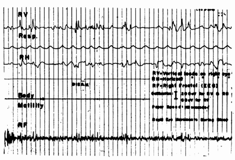 圖一 Aserinsky記錄到的睡眠中眼電和腦電的原始信號圖