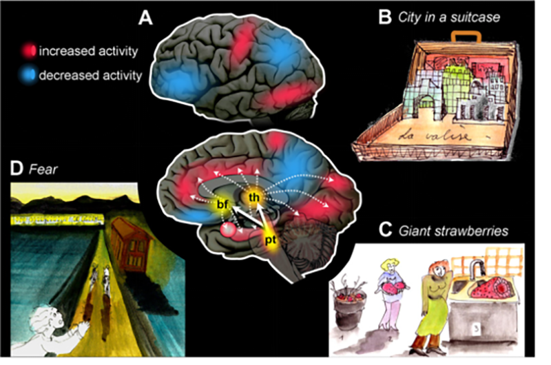 情景一體現(xiàn)了夢境場景和現(xiàn)實的分離,情景二體現(xiàn)的是視覺的變形;研究發(fā)現(xiàn),這兩種夢境出現(xiàn)時大腦中負責視覺信息處理的神經(jīng)通路——枕葉皮層到顳葉皮層高度激活,然而,大腦中負責更高級的、與邏輯推理相關(guān)的腦區(qū)——前額葉皮層的活動顯著下降。情景三中,人會產(chǎn)生的強烈恐懼情緒,這與大腦中的“恐懼中樞”杏仁核的激活有關(guān)。
