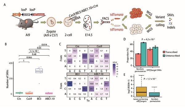 圖1 GOTI技術的原理及實驗流程:(A) 實驗流程. (B) 脫靶位點數目比較。Cre-, Cas9-, BE3- and ABE7.10組分別有14+/-12 (SEM, n=2),12+/-4 (SEM, n=11),283+/-32 (SEM, n=6)和10 +/- 5 (SEM, n = 4)個SNVs。(C) 突變類型的分布比較. 每個格子中的數字表示該種突變類型占全部突變的比例 (D) 脫靶SNVs富集在基因組中的轉錄區(qū)域。(E) Genes 包含脫靶位點的基因在細胞胚胎中有更高的表達量。