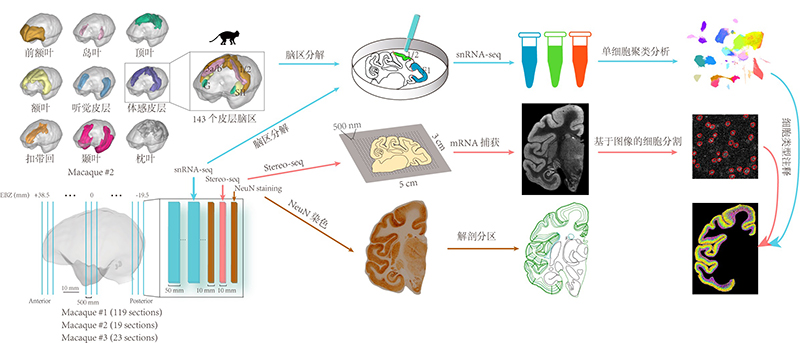 2023年7月12日23點, Cell期刊在線發表了題為“Single-cell spatial transcriptome reveals cell-type organization in macaque cortex”的研究論文,該研究成果由中國科學院腦科學與智能技術卓越創新中心(神經科學研究所)與華大生命科學研究院、臨港實驗室、上海腦科學與類腦研究中心、騰訊AI Lab、深圳國家基因庫、瑞典皇家理工學院、卡羅林斯卡醫學院等單位106人的科研團隊合作完成。該研究利用我國自主研發的超高精度大視場空間轉錄組測序技術Stereo-seq和高通量單細胞核轉錄組測序技術DNBelab C4 snRNA-seq,成功繪制了獼猴大腦皮層的細胞類型分類樹,并揭示了細胞類型組成和靈長類腦區層級結構之間的關系,為進一步研究各類神經元之間的連接提供了分子細胞基礎。
