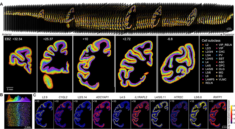 圖2. 獼猴大腦皮層細胞類型空間分布圖譜。(A) 數百種細胞類型在獼猴大腦不同位置(上)以及5張典型代表性切片(下)上的空間分布。(B)多種細胞類型呈現各層面的分布特異性。(C)五種細胞類型及其特征基因的空間分布和表達模式。