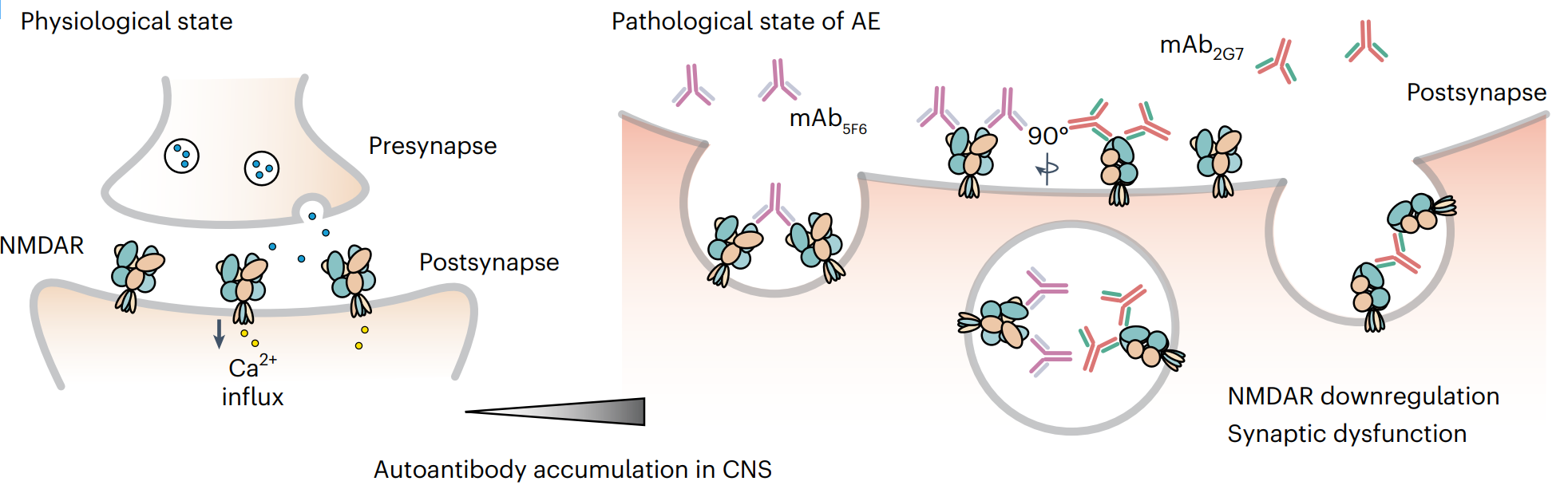 NMDA受體腦炎是一種由自身抗體介導(dǎo)的中樞神經(jīng)系統(tǒng)自身免疫性疾病,是最常見的自身免疫性腦炎類型。NMDA受體是一種在大腦中廣泛分布的興奮性谷氨酸受體,是學(xué)習(xí)和記憶等認(rèn)知功能的分子開關(guān)。該疾病于2018年被國(guó)家衛(wèi)生健康委員會(huì)等五部門納入第一批罕見病目錄,其特點(diǎn)是免疫系統(tǒng)產(chǎn)生致病性自身抗體,錯(cuò)誤地攻擊大腦中的NMDA受體,導(dǎo)致受體從神經(jīng)元表面被內(nèi)吞,從而減弱了NMDA受體在突觸傳遞和功能中的作用(圖1)。因此,抗NMDA受體腦炎患者通常伴有精神異常、記憶和認(rèn)知障礙、癲癇發(fā)作、運(yùn)動(dòng)障礙、自主神經(jīng)功能紊亂等多種癥狀。患者腦脊液和/或血清中的抗NMDA受體抗體是該疾病臨床診斷的分子標(biāo)記物,但這些抗體結(jié)合的表位及導(dǎo)致NMDA受體功能障礙的機(jī)制一直是領(lǐng)域內(nèi)的未知。