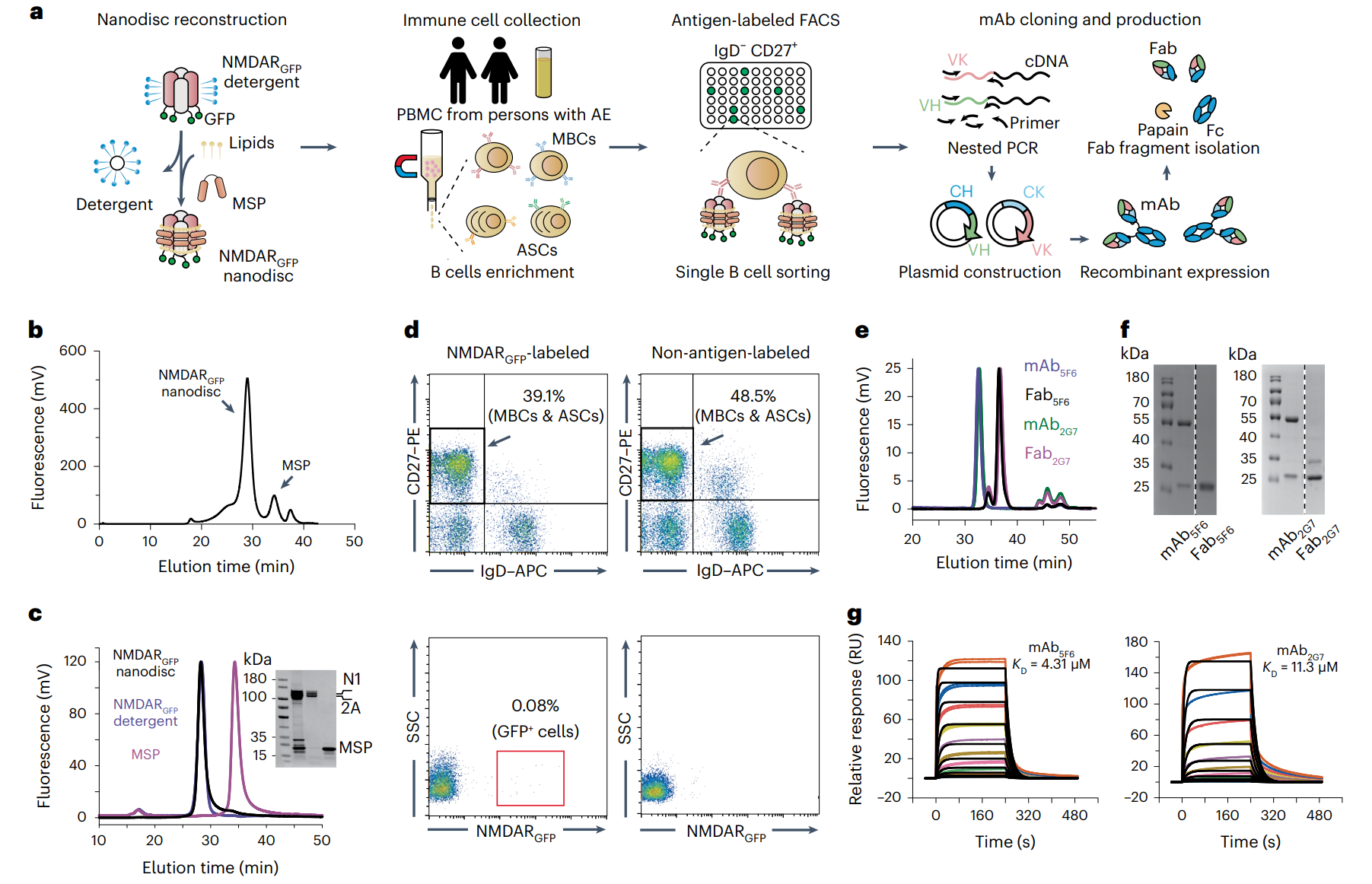 研究團(tuán)隊(duì)首先構(gòu)建了帶有GFP標(biāo)簽的NMDA受體納米盤(NMDARGFP),把它作為結(jié)合致病抗體的熒光篩選抗原標(biāo)記物,標(biāo)記并分選出來自抗NMDA受體腦炎患者血液樣品里的單個(gè)B細(xì)胞。通過流式分選出抗NMDA受體腦炎外周血單個(gè)核細(xì)胞中IgD-CD27+B細(xì)胞,發(fā)現(xiàn)其中約0.08%B細(xì)胞被NMDARGFP標(biāo)記。對(duì)這些GFP標(biāo)記的細(xì)胞進(jìn)行單細(xì)胞分選并收集,通過逆轉(zhuǎn)錄并擴(kuò)增出編碼輕鏈和重鏈可變區(qū)域的致病單抗序列。基于活細(xì)胞染色及表面等離子共振,鑒定和分析這些致病單抗與NMDA受體的結(jié)合特性(圖2)。